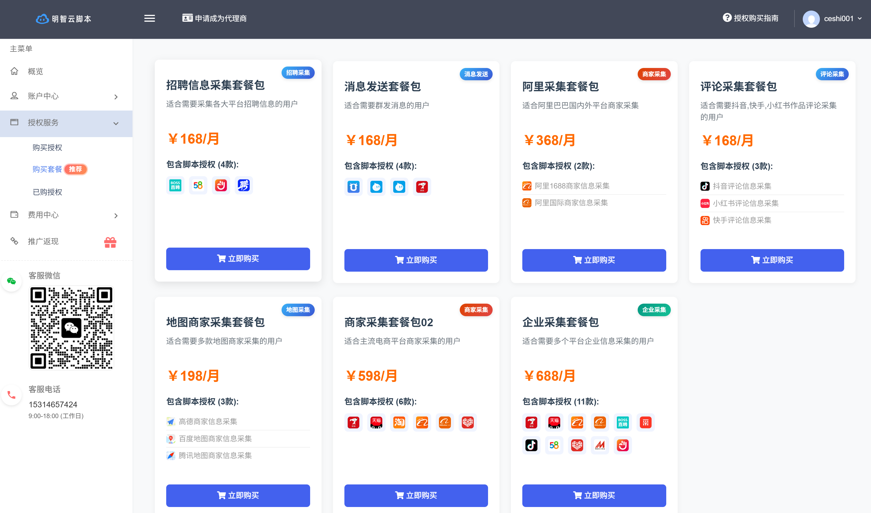 软件套餐包是明智云脚本针对不同用户需求(如电商商家采集、商品采集、企业信息采集、招聘信息采集、消息群发等)推出的一系列服务组合,包含对应平台的脚本授权。