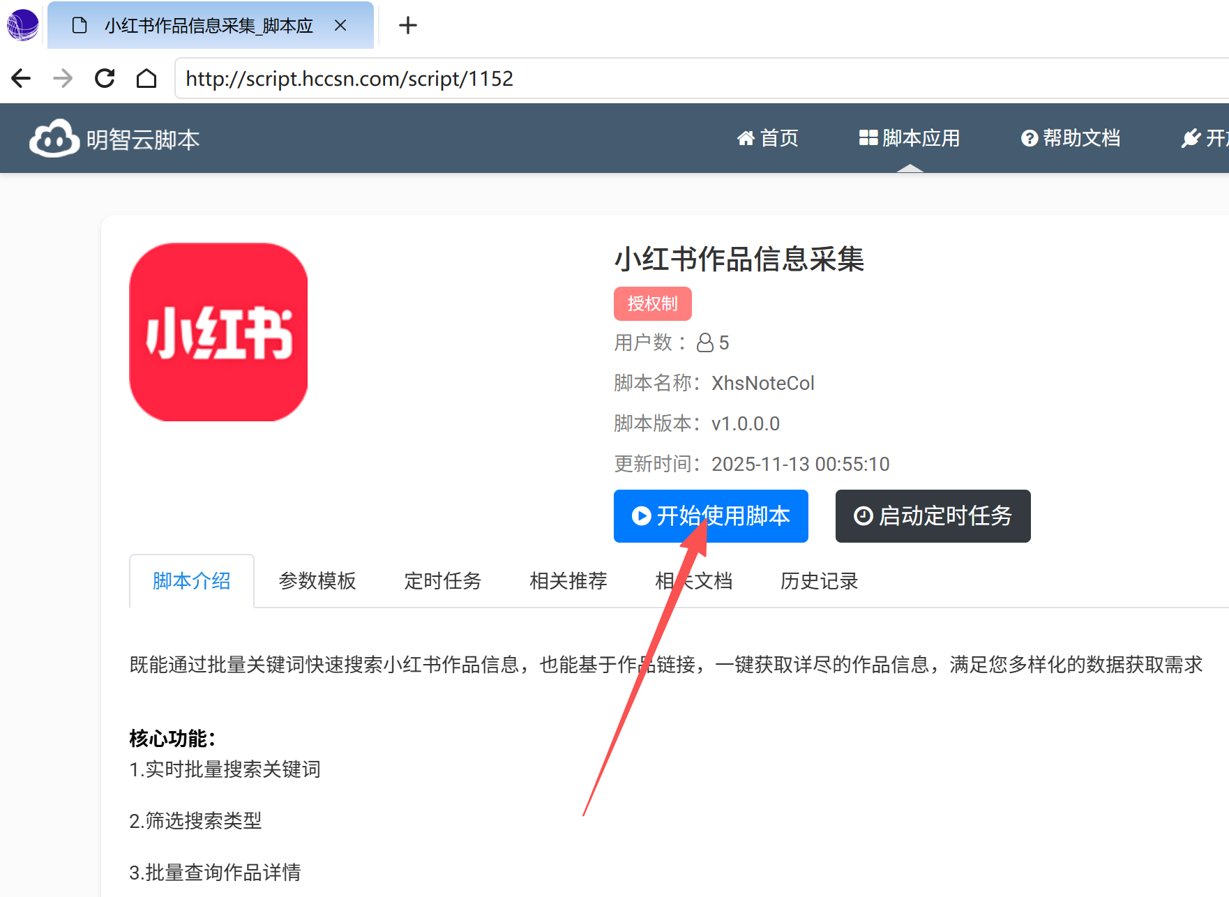 1. 打开明智云脚本平台,在脚本列表中找到【小红书作品信息采集】。