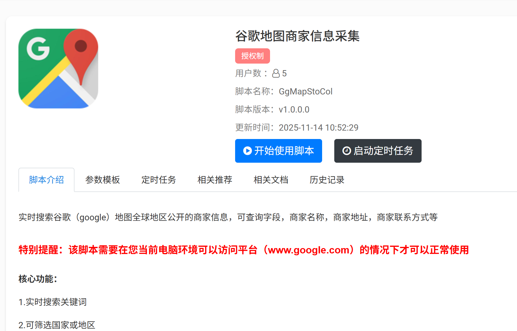 在明智云脚本平台中找到"谷歌地图商家信息采集"脚本