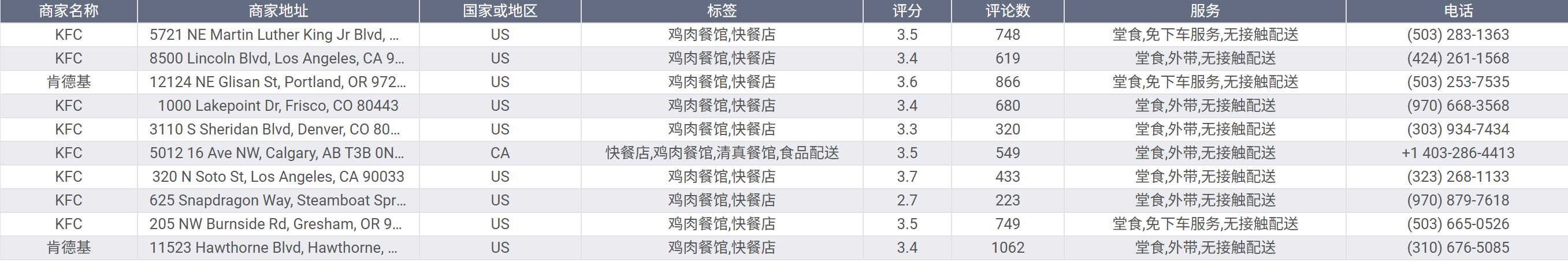 采集字段包括: 商家名称、商家地址、商家服务区、 标签、评分、评级数、服务类型、联系电话等。