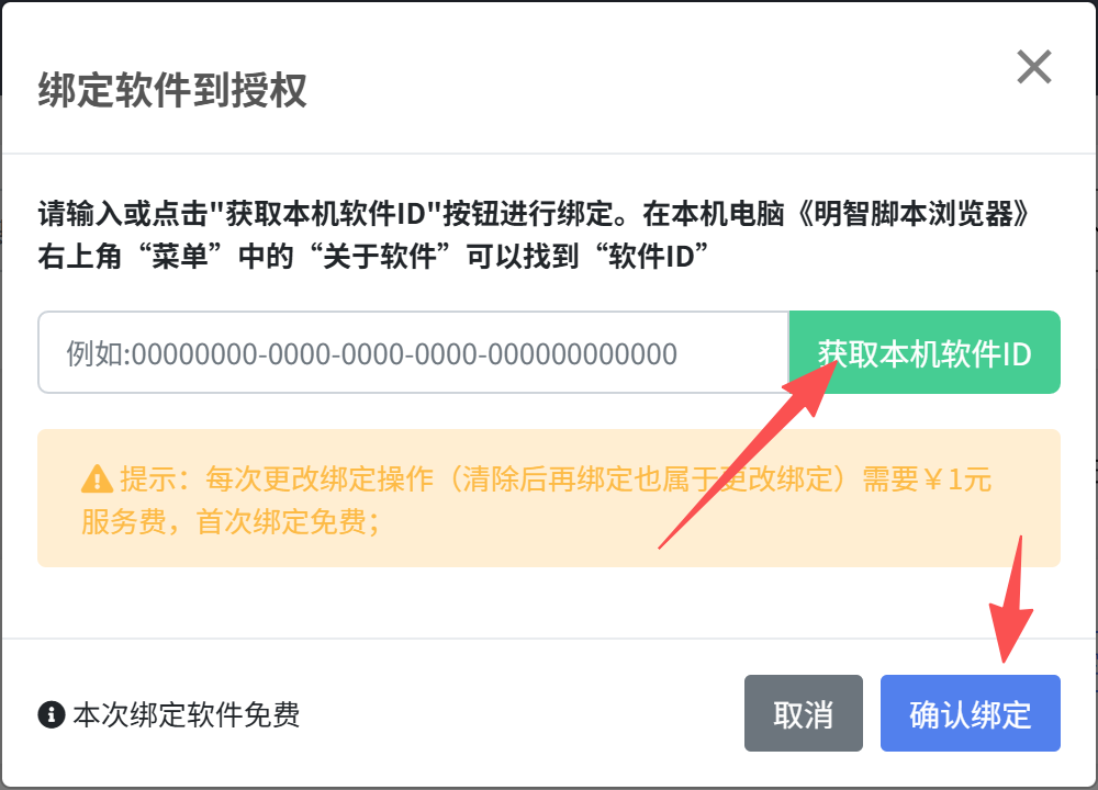 步骤3:输入获取到的软件ID后,点击“确认绑定”按钮完成更换绑定,首次绑定免费,后续更换每次需1元服务费。